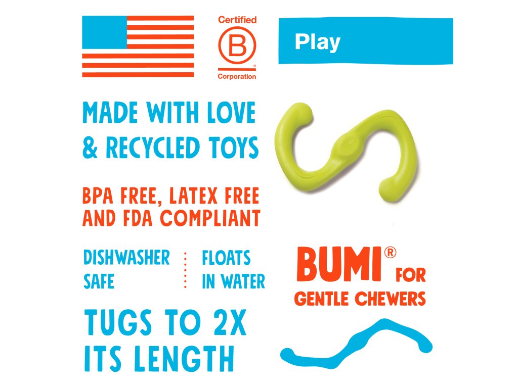 Máme dobrou zprávu pro všechny vášnivé tahavce. S Bumi se rozhodně nudit nebudete! Odolná hračka, která se natáhne až na dvojnásobek své délky. Je vhodná na aportování, přetahování a hrátky ve vodě. Díky “S” tvaru se hezky hází, skáče a natahuje.